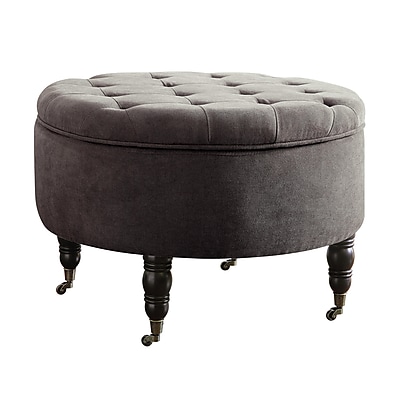 This ottoman offers a bold look and plenty of comfort for overflow seating or footrest functions. Crafted from sandblasted black metal finished in black, this ottoman is easy to assemble and maintain. The storage ottoman will instantly be the star of the living room, family room or den. Navy velvet fabric upholstered tufted round cocktail ottoman with casters. The ottoman is upholstered in high quality pu leather and completed with button tufting.
